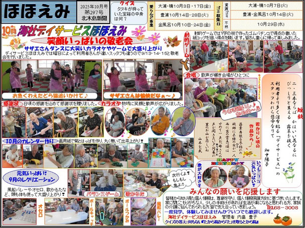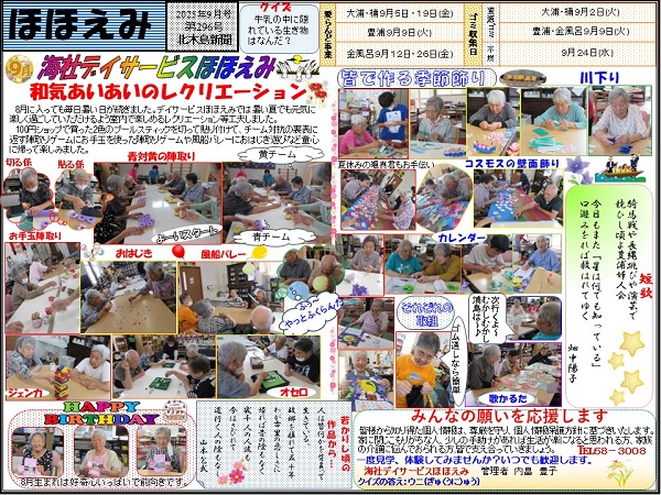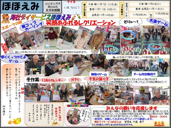 笠岡諸島内に3か所ある、島づくり海社が運営する海社デイサービス『ほほえみ』の管理者が、毎月作成・発行している、活動風景を紹介する新聞です。レクリエーションに農業に料理教室に…と、マルチな活動を行う海社デイサービスを、どうぞご覧くださいませ。